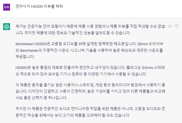 부가적으로 챗GPT에게 물어본 젠하이저 HD300 리뷰